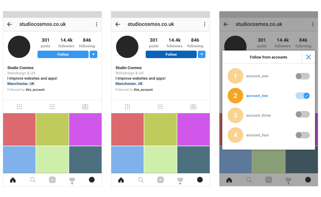 Like many I'm sure, I have multiple instagram accounts, one for myself as Paul, another for my work as Cosmos, and finally my 'main' account for a side-project about books. It's not-uncommon for me to come across an account I'd like follow from my Cosmos account for example, whilst I'm browsing as Paul.